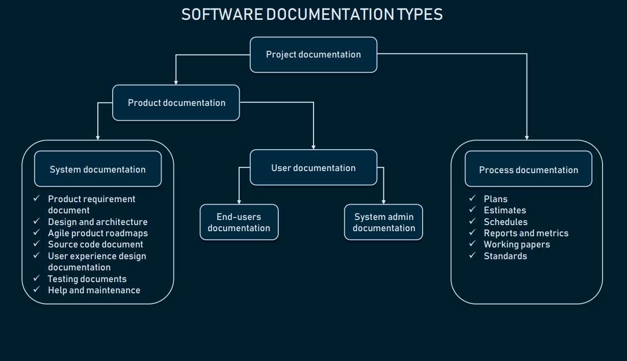 The main goal of effective documentation is to ensure that developers and stakeholders are headed in the same direction to accomplish the objectives of the project. To achieve them, plenty of documentation types exist.
